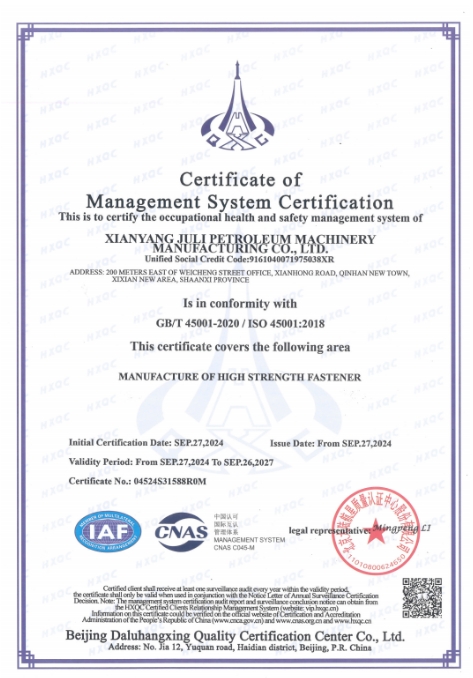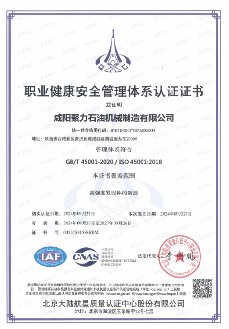 咸陽聚力石油機(jī)械制造有限公司取得了ISO9001: 2015質(zhì)量體系認(rèn)證;環(huán)境和職業(yè)健康ISO14001:2015、ISO45001:2018體系認(rèn)證;全國標(biāo)準(zhǔn)件科技情報(bào)理事單位;中石油供應(yīng)商一級(jí)網(wǎng)絡(luò)單位;產(chǎn)品取得了國家特種設(shè)備(壓力管道用緊固件)生產(chǎn)許可證;公司先后獲得了兩項(xiàng)專利。公司產(chǎn)品通過第三方先后出口歐洲、蘇丹、柬埔寨和西班牙等國。